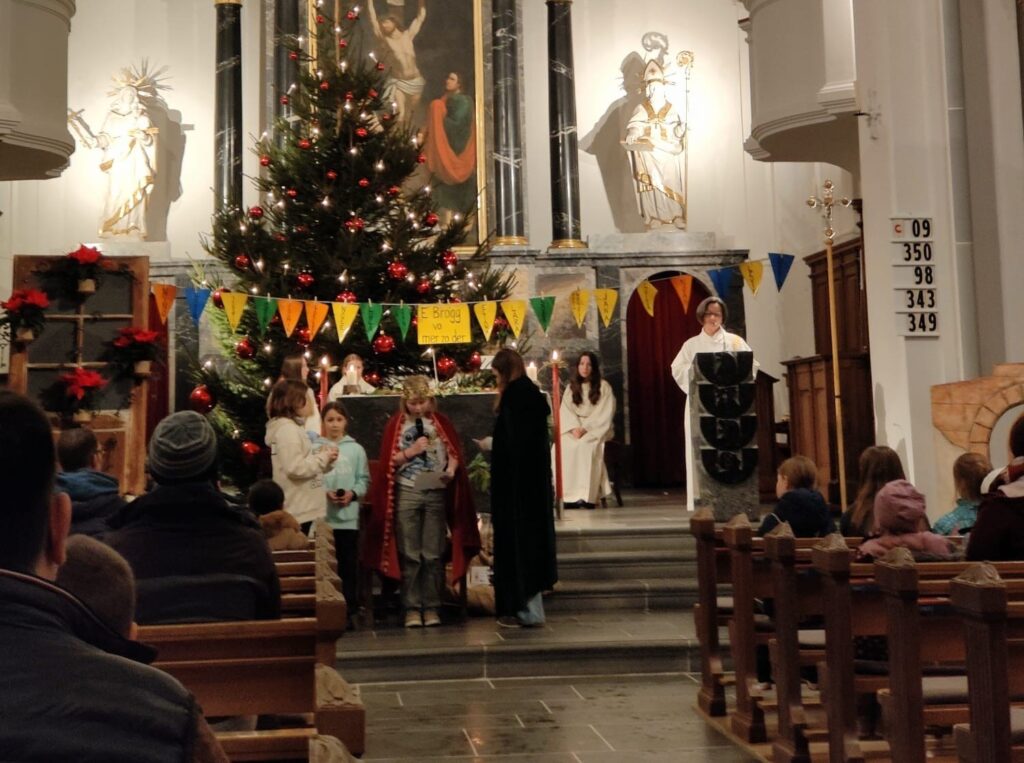 Zum Evangelium spielten die Sternsingerinnen und Sternsinger der Jubla und Minis eine Szene vom König Herodes. Dieser schickte die Sterndeuter nach Betlehem, um das geborene Jesuskind zu suchen, mit der Absicht, es zu töten. Die Sterndeuter folgten dem Stern. Der Anblick des Kindes in der Krippe erfüllte sie mit grosser Freude. Sie knieten nieder, holten ihre Schätze hervor und schenkten ihm Gold, Weihrauch und Myrrhe. König Herodes aber sagten sie nichts.